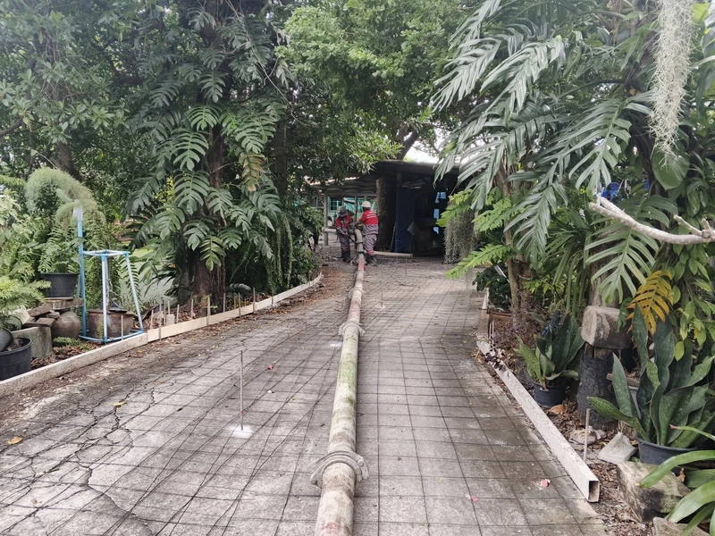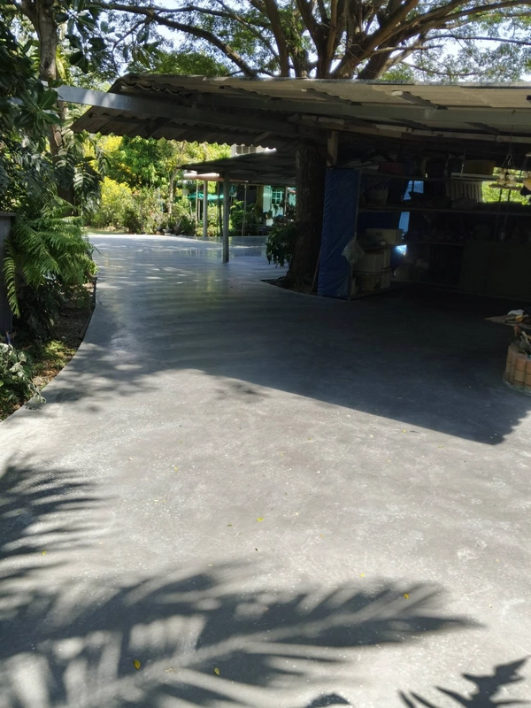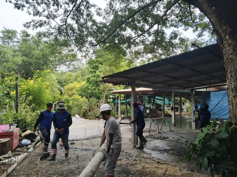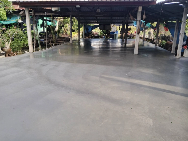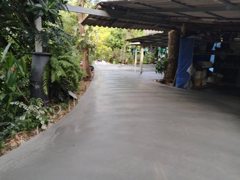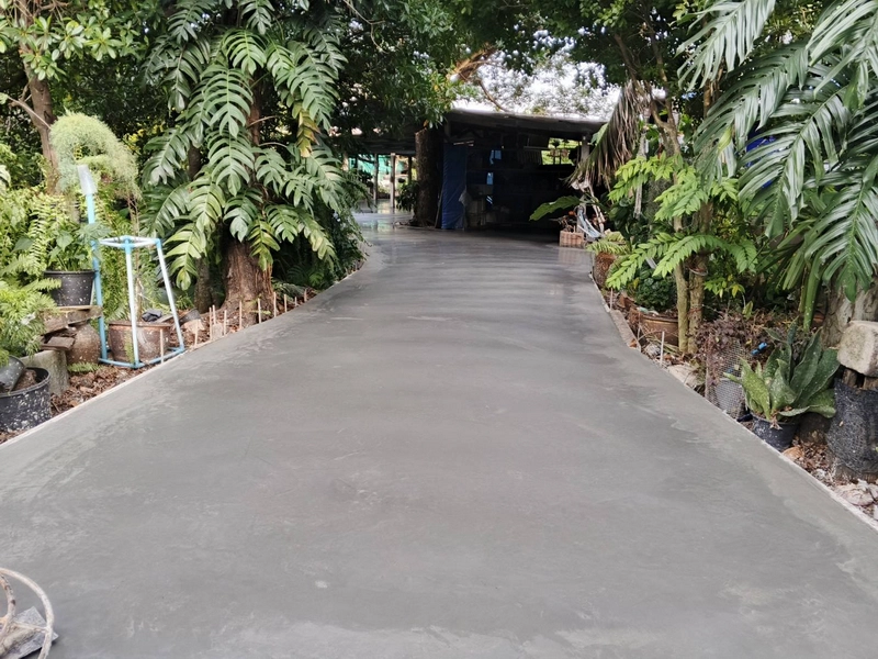 - วัสดุและการเท: ใช้คอนกรีตมาตรฐานจากแพล้นปูน เทความหนาที่ 10 เซนติเมตร ตามมาตรฐานการใช้งานทั่วไป