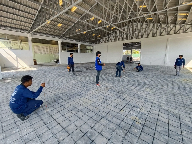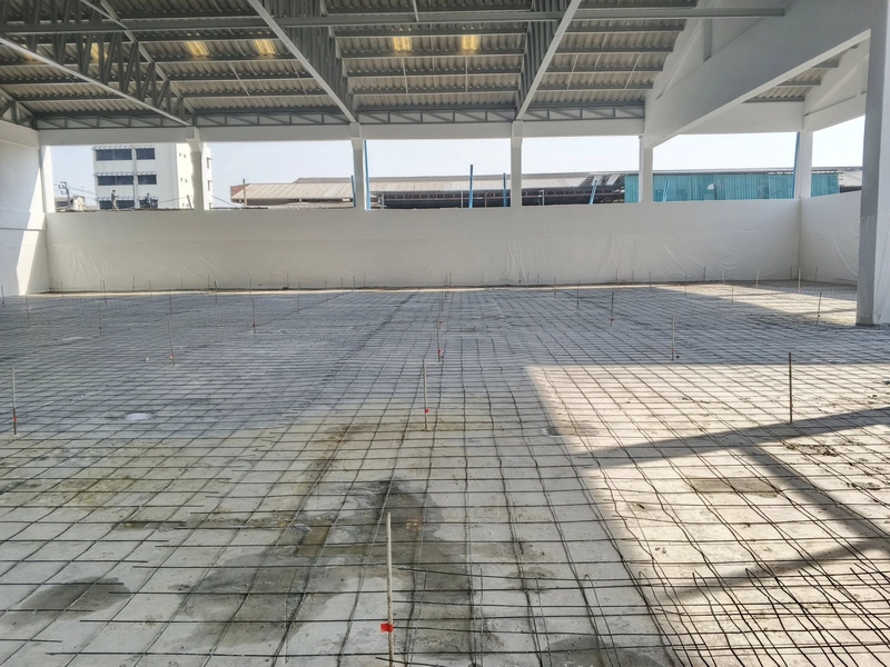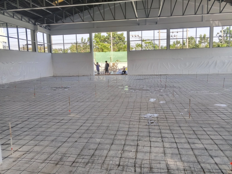 - งานโครงสร้าง: เสริมเหล็กไวร์เมช (Wire Mesh) ขนาด 4 มิลลิเมตร เพื่อเพิ่มแรงยึดเกาะและป้องกันการแตกร้าวของพื้นโกดัง