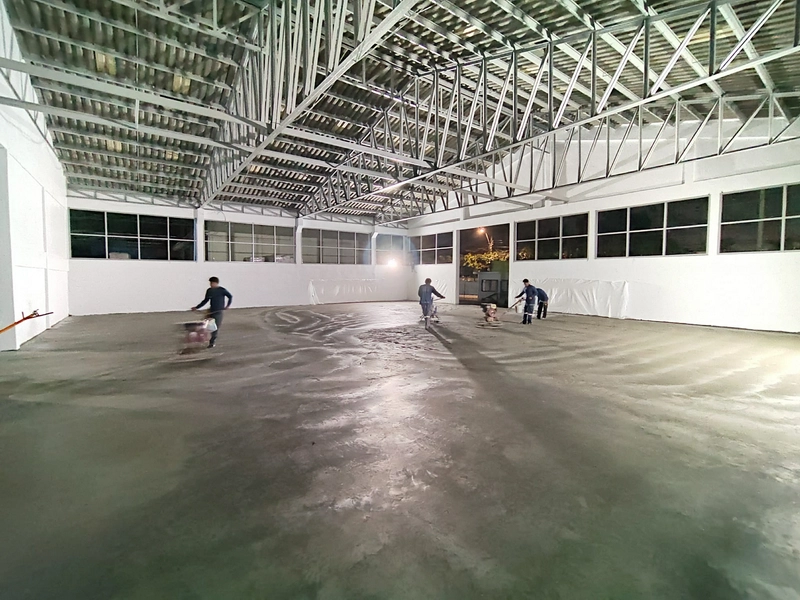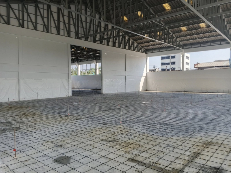 - วัสดุและการเท: เลือกใช้คอนกรีตมาตรฐานปูนแพล้นคุณภาพสูง เทความหนาที่ 10 เซนติเมตร ตามมาตรฐานการใช้งานโกดังทั่วไป